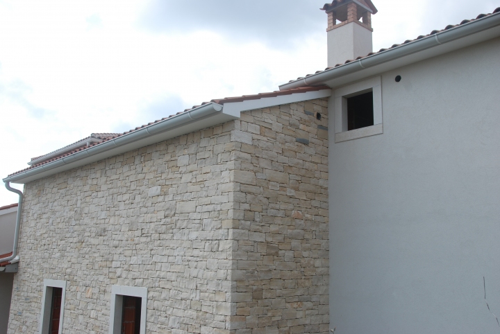 Istria Dry Stone is a cladding system performed without grouting the space between the stones. Single stones are obtained from the limestone slate and therefore their upper and lower surfaces are naturally flat, which is perfect for performing dry-stone walls, because it does not require any other treatment of the surfaces. Hew treatment needs to be performed on the vertical surfaces to obtain uniform thickness of the space between the stones. Finished cladding gives a light cream colour to the wall. The colour tones vary from stone to stonewhich gives a special charm to the final cladding.